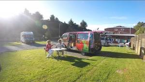 Onze camper valt wel enorm uit de toon tussen de rest van de blinkend witte, veel grotere gevaartes, waar de veelal senioren in hun matchende Human Nature-outfits de een na de andere handige gadget uit tevoorschijn toveren. Voordeel is wel dat wij op 10 manieren op 1 plek kunnen staan en zij zich met veel moeite binnen de plaatsafscheidingen weten te manoeuvreren.