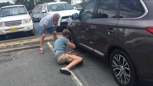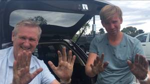 In Nederland zijn we gewend dat er dan een smal bandje onderaan de auto hangt, waarmee je thuis kunt komen, zo niet in Australië, want hier zat gewoon een compleet nieuwe band inclusief lichtmetalen velg onder de auto. Binnen een kwartiertje hadden Jitze en m’n vader deze vervangen en konden we weer op pad, naar Albury.